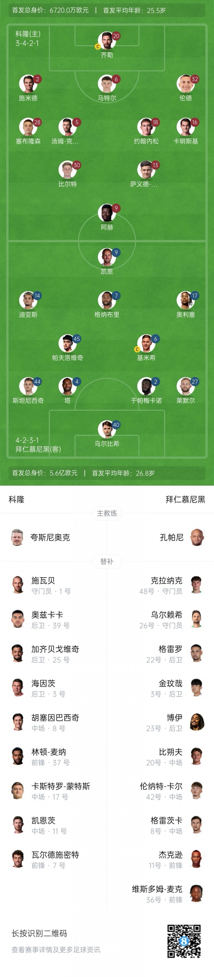 10月30日讯 德国杯第2轮,拜仁客战科隆,赛前双方杆位公布。